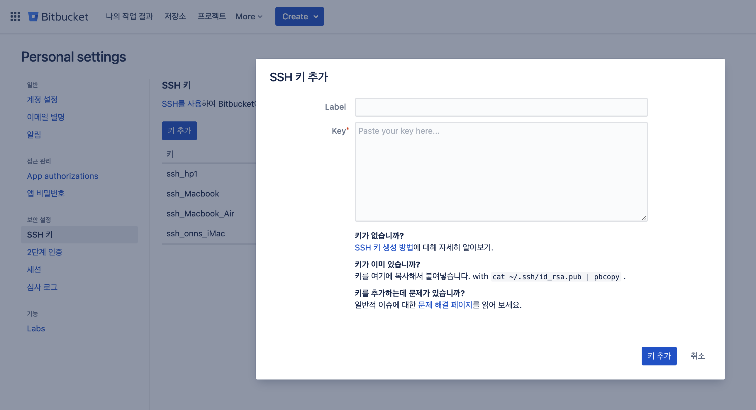 만약 회사에서 빗버킷을 사용중이라면 내 컴퓨터의 SSH키를 등록해줘야 푸쉬, 클론 등등 git작업이 가능해진다.