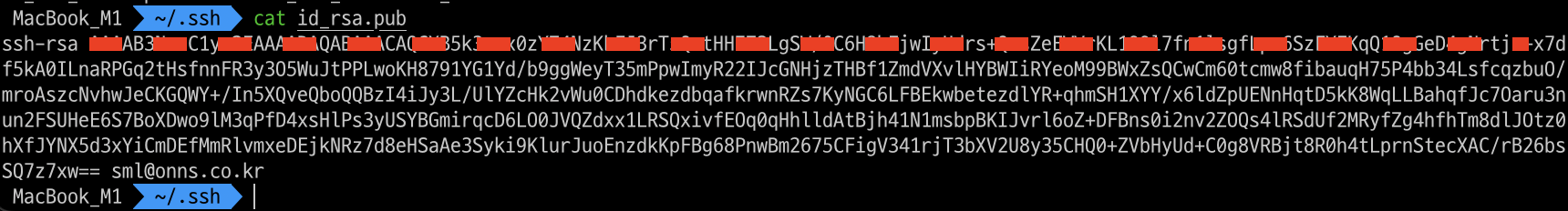 4. 폴더를 찾았으면 .ssh폴더 안에 들어가서 id_rsa.pub 파일을 찾는다. 찾았다면 cat id_rsa.pub 명령어로 파일을 열어본다.