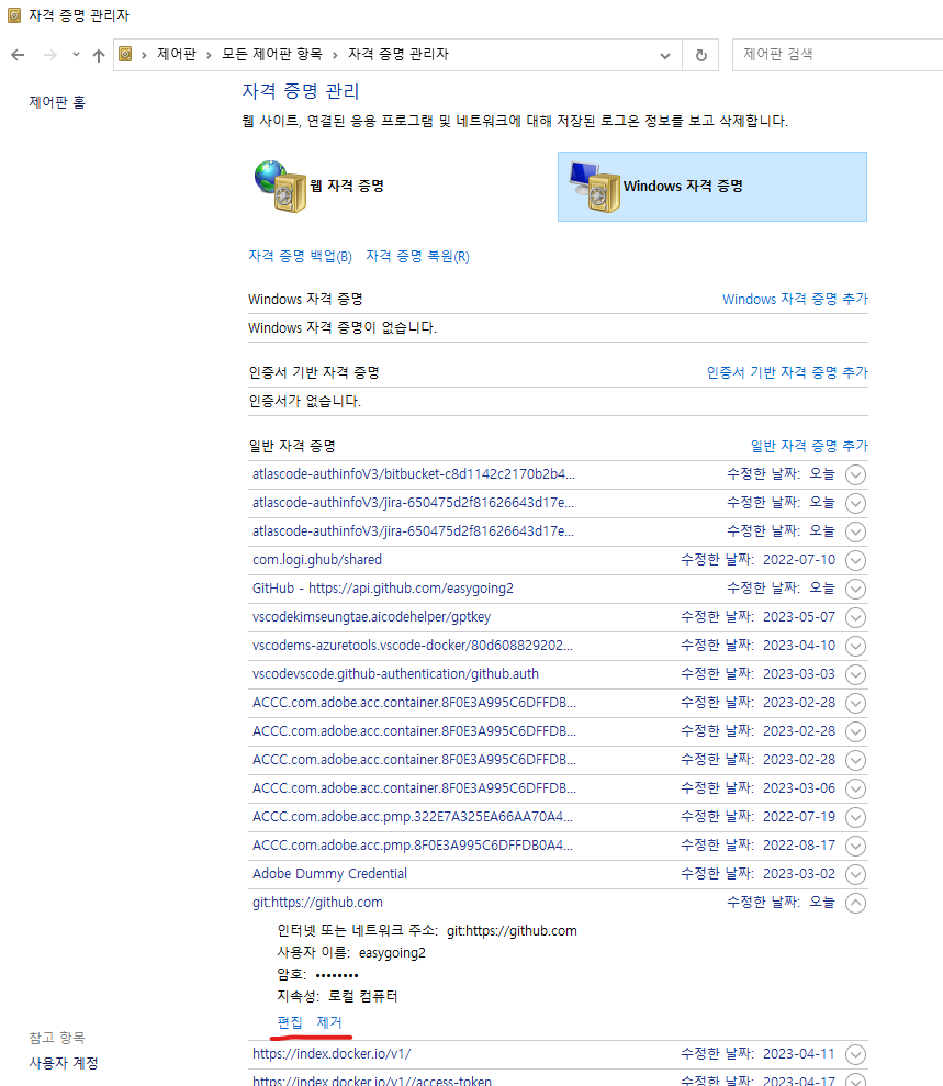 제어판 -> 사용자 계정 -> 자격 증명 관리